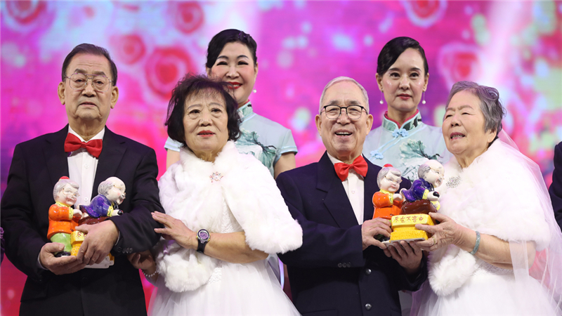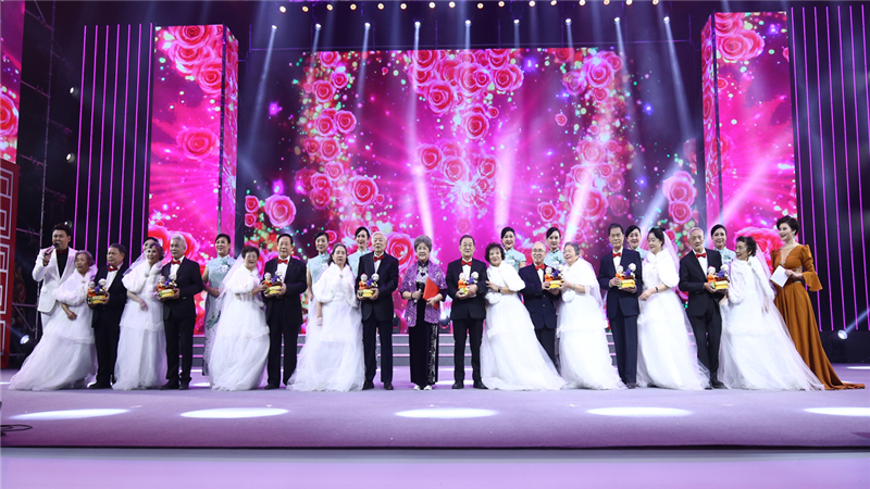 最美不過(guò)夕陽(yáng)紅,最浪漫的事就是和你一起慢慢變老。晚會(huì )還為來(lái)自全國各地平均年齡80歲的8對金婚、鉆石婚老年伉儷舉辦了隆重的金婚、鉆石婚慶典,彰顯了尊老、敬老、愛(ài)老的中華民族傳統美德。