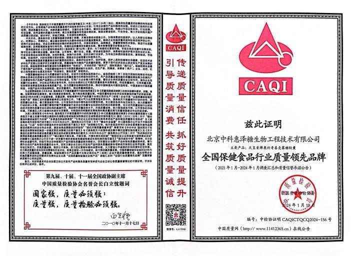 2024年“3·15”主題活動(dòng)期間,中國質(zhì)量檢驗協(xié)會(huì )向北京中科惠澤糖生物工程技術(shù)有限公司頒發(fā)了“全國產(chǎn)品和服務(wù)質(zhì)量誠信示范企業(yè)”、“ 全國保健食品行業(yè)質(zhì)量領(lǐng)先品牌”兩項榮譽(yù)證書(shū),這是中科惠澤公司連續13年獲此殊榮。紅彤彤的榮譽(yù)證書(shū),是對中科惠澤24年來(lái)誠信經(jīng)營(yíng),堅持高質(zhì)量發(fā)展,不斷提升廣大消費者信心的高度贊譽(yù)和肯定。