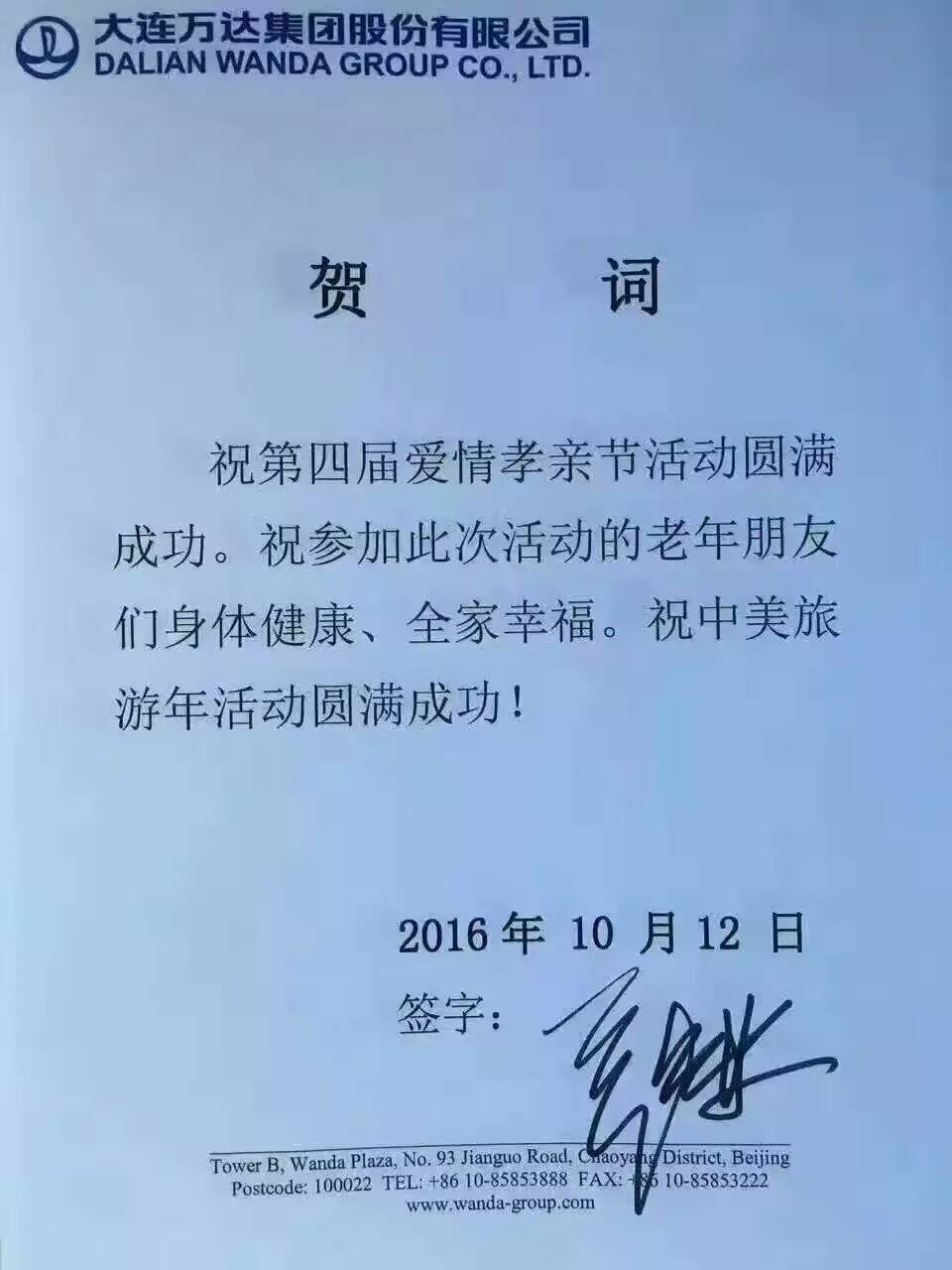 萬(wàn)達集團董事長(cháng)王健林特發(fā)來(lái)祝賀視頻:“今年是中美旅游年,祝第四屆愛(ài)情孝親節活動(dòng)成功舉辦。祝參加活動(dòng)的老年朋友們身體健康、玩的開(kāi)心。祝中美旅游年圓滿(mǎn)成功!”